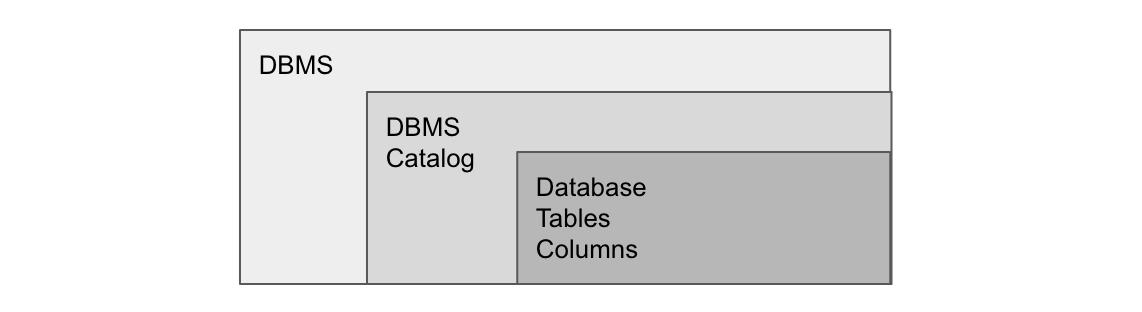 Database catalog : DBMS는 Catalog에 데이터베이스, 테이블, 컬럼 간의 관계와 정의를 메타 데이터 형태로 저장해서 사용합니다.